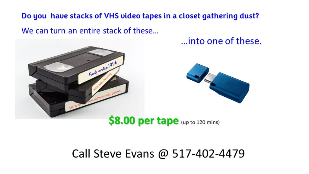 Family memories captured on 8mm film and VHS tapes are priceless—but the clock is ticking. These formats fade, warp, and break down over time, risking the loss of irreplaceable moments. Digitizing them protects your family’s story, making it easy to share, store, and enjoy for generations. Preserve the laughter, the milestones, and the everyday magic before they disappear. Your legacy deserves a future. At Evans Media-Michigan we can help you preserve your memories for future generations. Call Steve today at 517-402-4479 or email emgmichigan@gmail.com